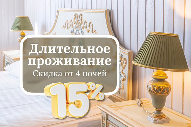- Скидка 15% предоставляется на тариф «Полный пансион» при бронировании от 4 ночей подряд;